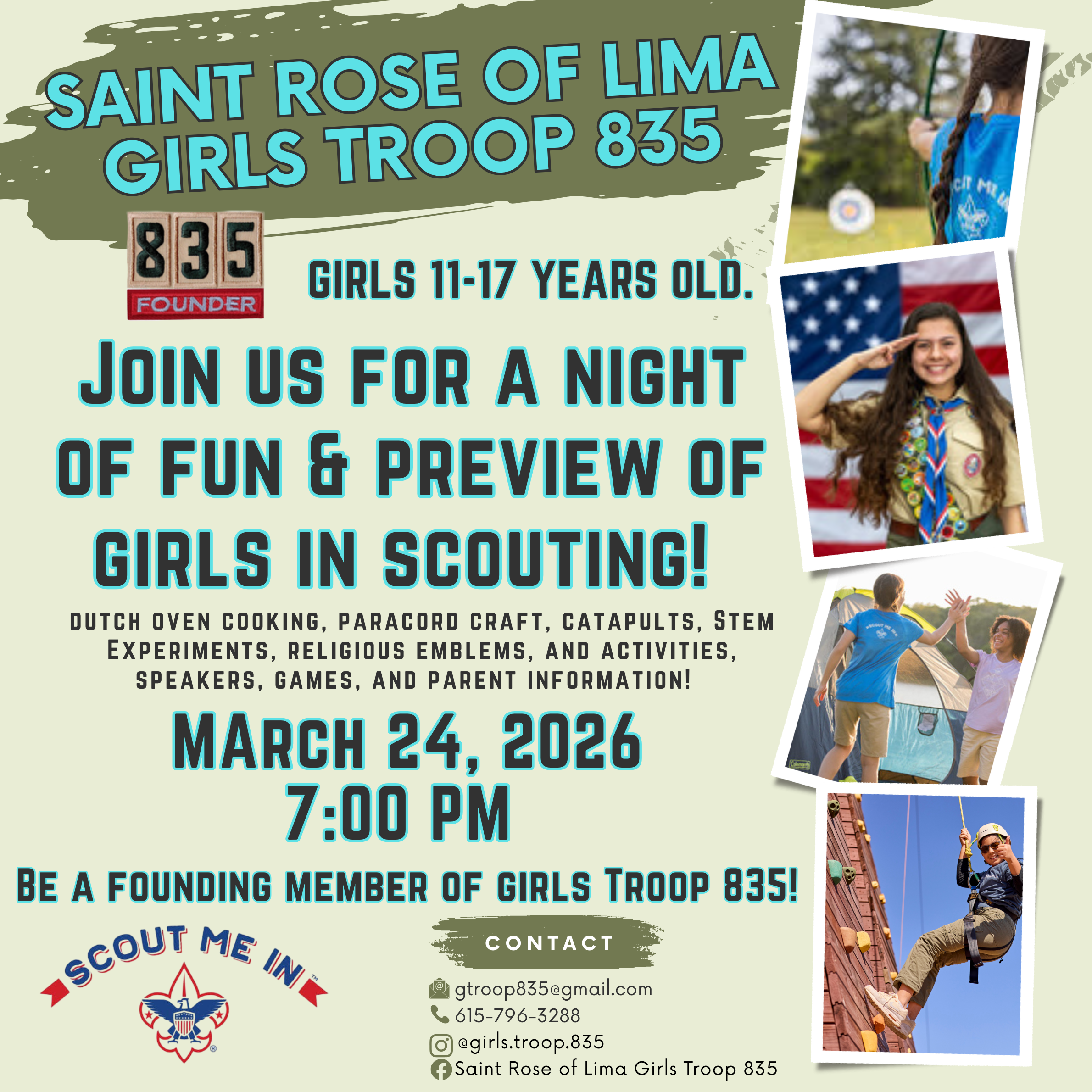 Now Forming Saint Rose of Lima Girls Troop 835! Exciting new opportunities are coming to the Diocese of Nashville Scouting. Scouting America Troop 835 will serve girls ages 11–17 in our parish.